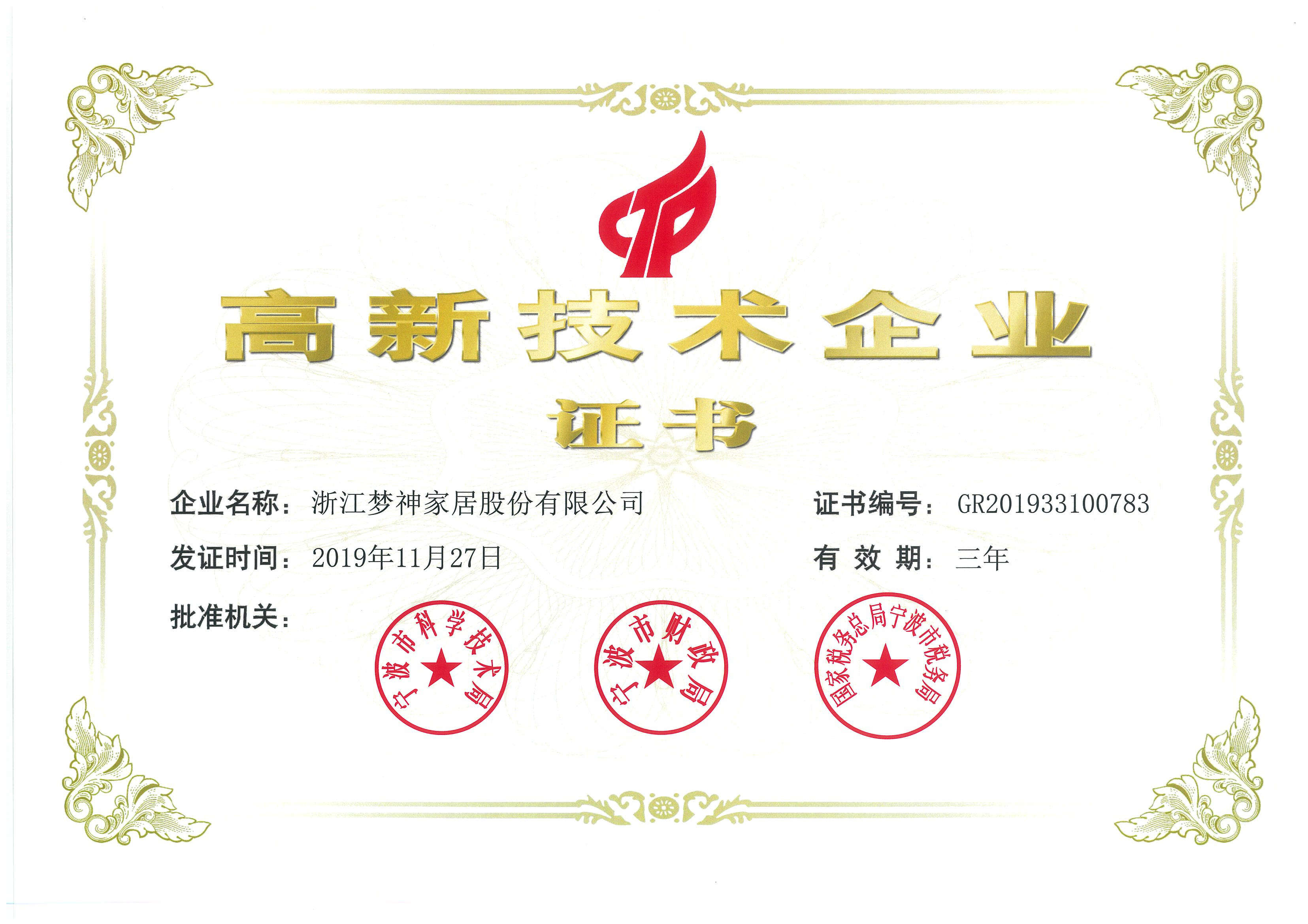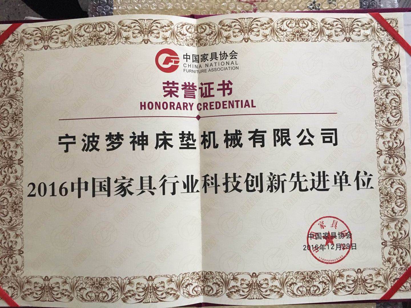 2016中國家具行業(yè)科技創(chuàng)新先進單位(寧波夢神)